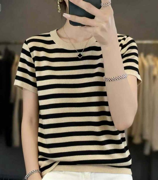 夏季新款撞色条纹针织短袖T桖,独立包装,均码面料柔软舒适弹力大,258件,全清6.9元超低价秒杀!分货加一!