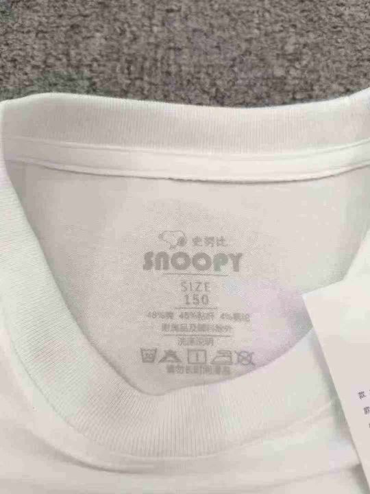 品牌史努比童装个性T恤短袖 尺码110--160 数量2000件左右 整款单色 胸前有口袋 后领包边 独立包装带吊牌 大货干净整洁