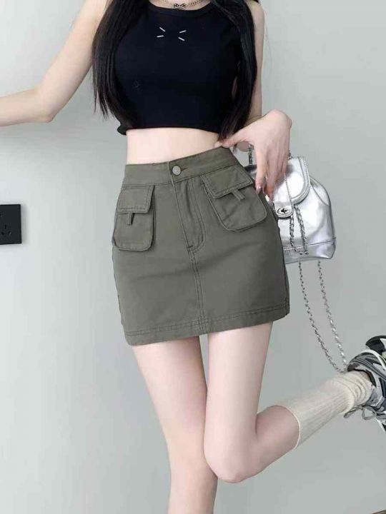 ☕️辣妹军绿色工装牛仔半身裙女美式短裙夏季A字包臀...