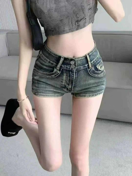 夏季新款高弹力性感辣妹洗水棉复古牛仔短裤,独立包装...