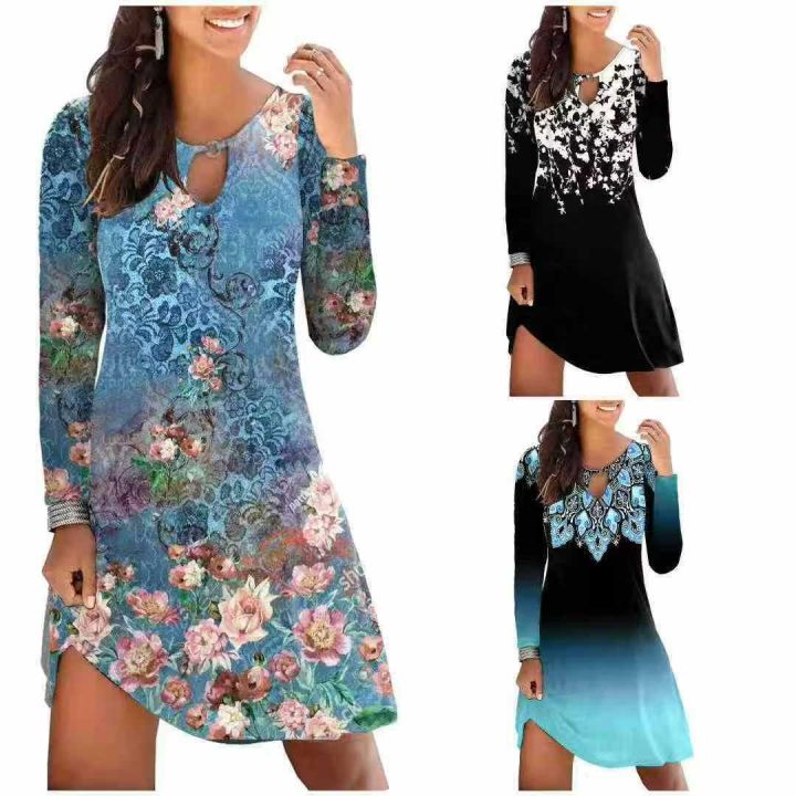 工厂回收413件外贸爆款长袖印花圆环金属连衣裙女,码数S-2XL。面料柔软有弹性,货品新净,有独立包装,分货➕0.5。