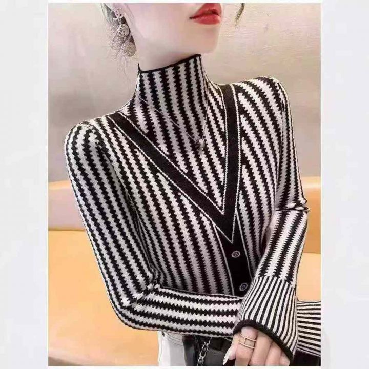 秋冬新款半高领时髦时尚洋气条纹提花包芯纱套头毛衣,...