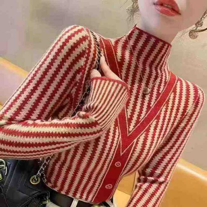 秋冬新款半高领时髦时尚洋气条纹提花包芯纱套头毛衣,...
