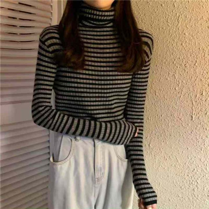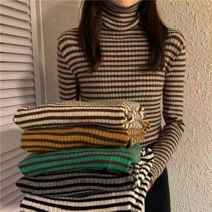 秋冬新款撞色条纹高领打底外穿套头毛衣,独立包装,均...