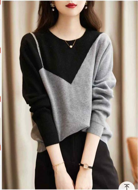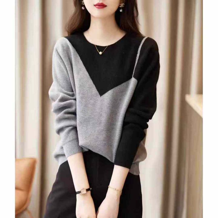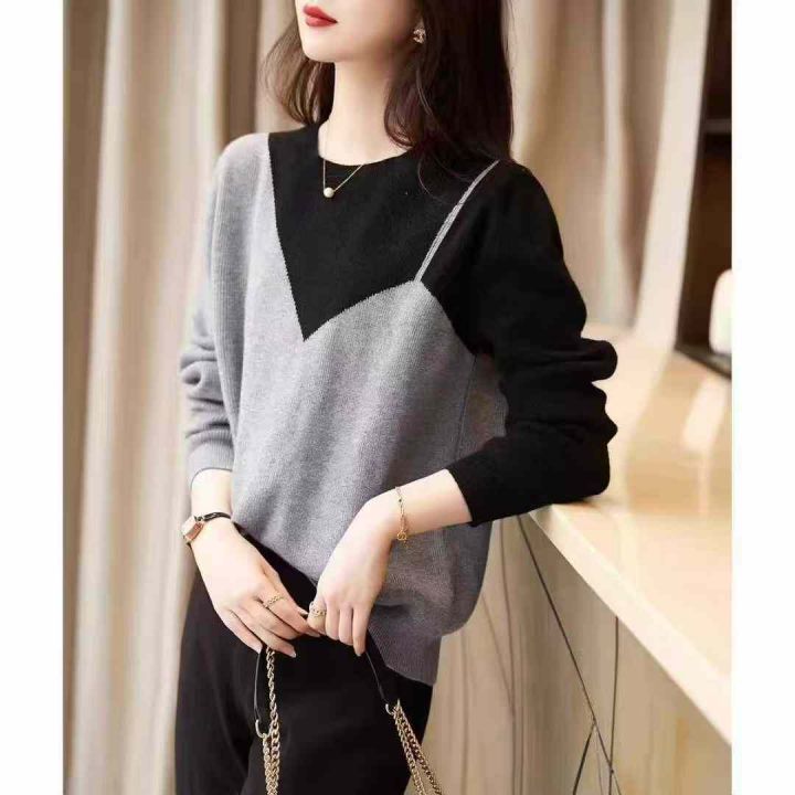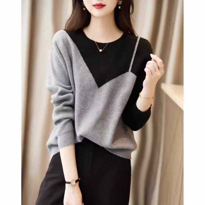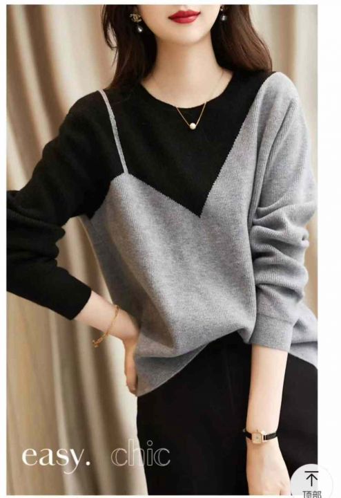 秋季新品宽松显瘦气质撞色假两件圆领包芯纱套头毛衣,...