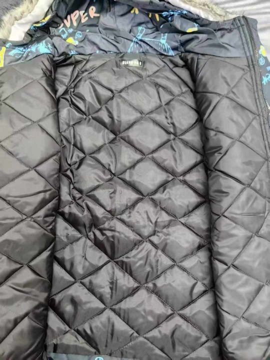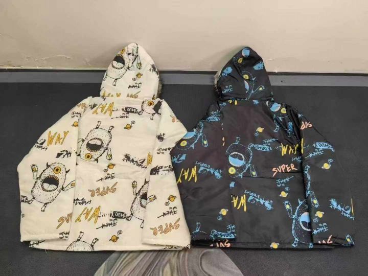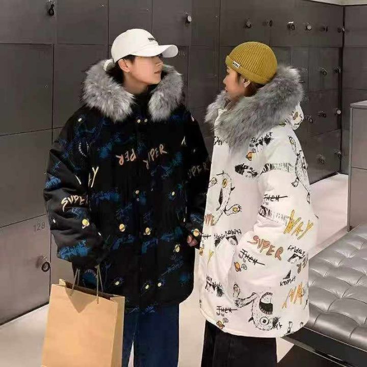 天猫在售款110件高品质情侣款潮牌满印加厚宽松大版毛领棉服,单款两色,M-2XL,独立包装带吊牌