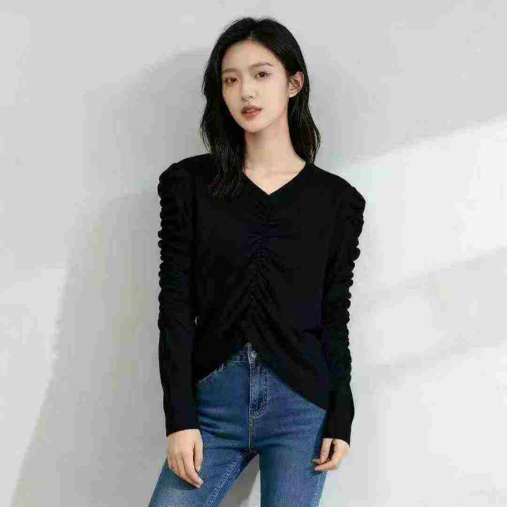 设计褶皱锁骨长袖辣妹修身新款收腰显瘦针织上衣,独立...