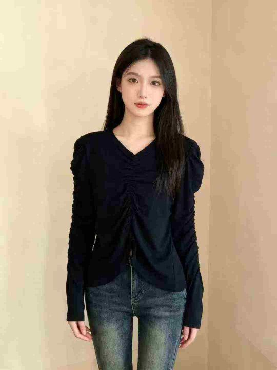 设计褶皱锁骨长袖辣妹修身新款收腰显瘦针织上衣,独立包装,均码,380件,清6.9,分➕1