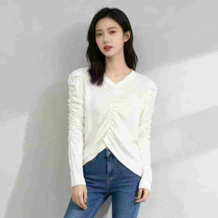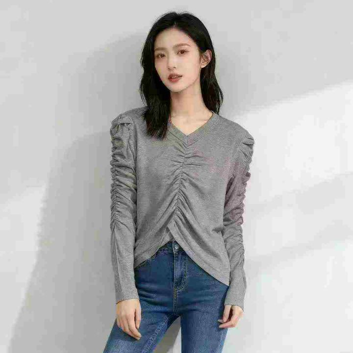 设计褶皱锁骨长袖辣妹修身新款收腰显瘦针织上衣,独立...