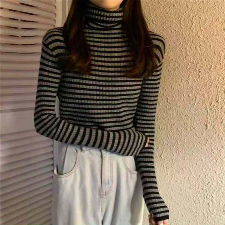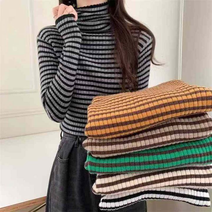 秋冬新款撞色条纹高领打底外穿套头毛衣,独立包装,均...