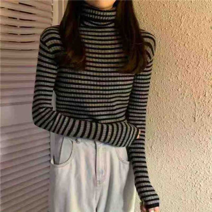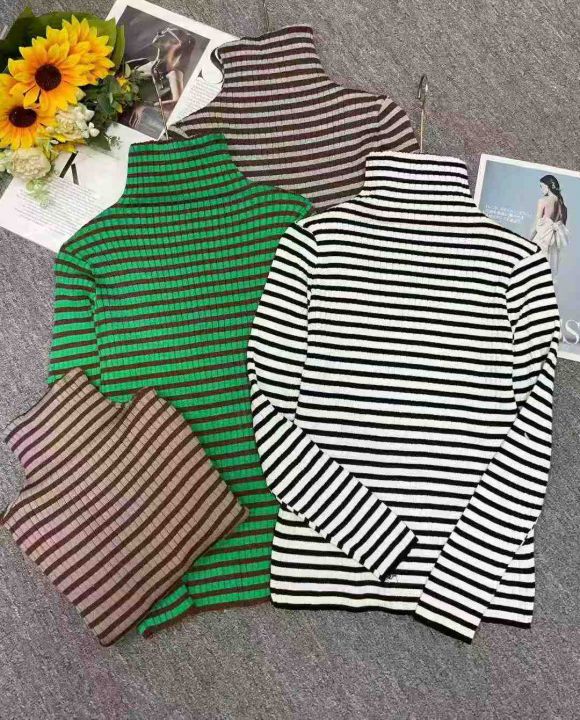 秋冬新款撞色条纹高领打底外穿套头毛衣,独立包装,均...