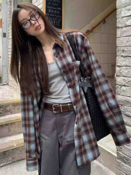 全清价8.9元女士爆款韩版潮牌美式慵懒中长款长袖格子...