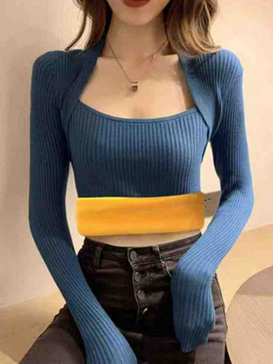 冬季新款加绒加厚方领弹力修身显瘦洋气套头毛衣,独立...