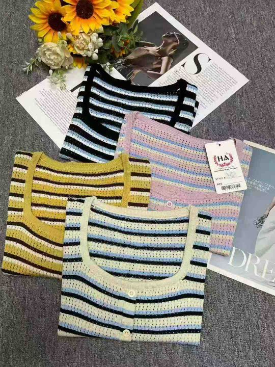 夏季新款微胖mm条纹撞色方领甜美减龄单排扣冰丝针织短袖T桖,独立包装,均码面料柔软舒适透气,宽松版,1000件,全清6.9元超低价秒杀!分货加一!
