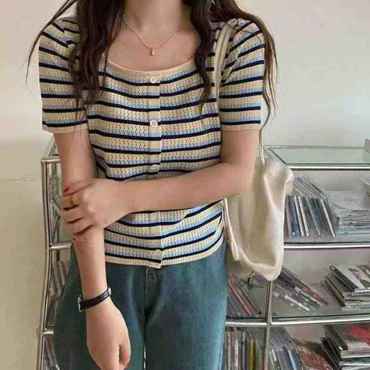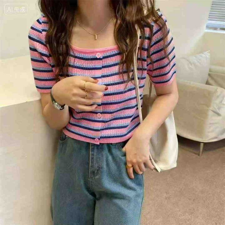 夏季新款微胖mm条纹撞色方领甜美减龄单排扣冰丝针织短...