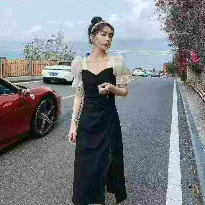 法式侧开叉黑色连衣裙夏季新款轻熟风设计感气质小裙子