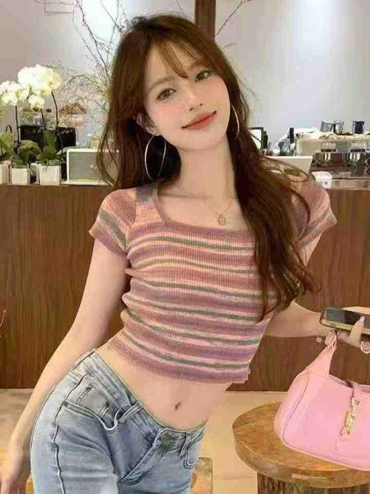 夏季新款撞色彩虹条纹靓妹针织短袖小衫,独立包装,均...