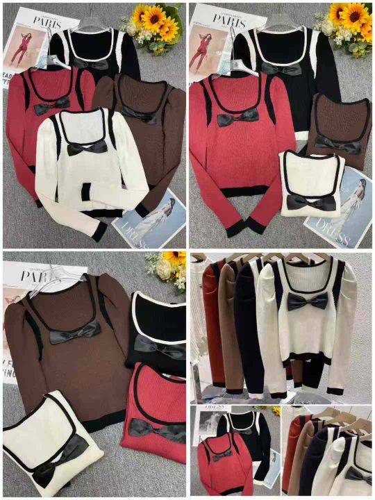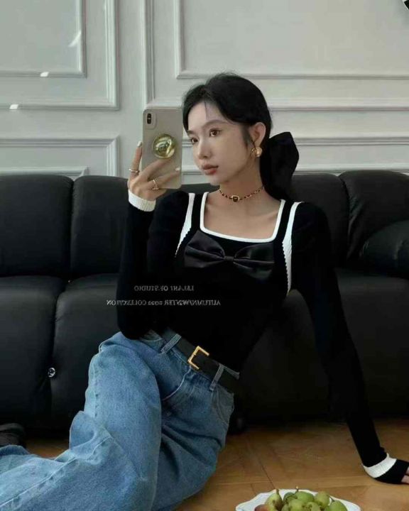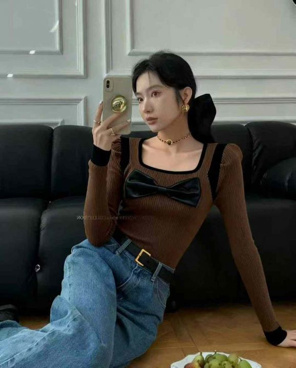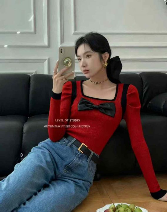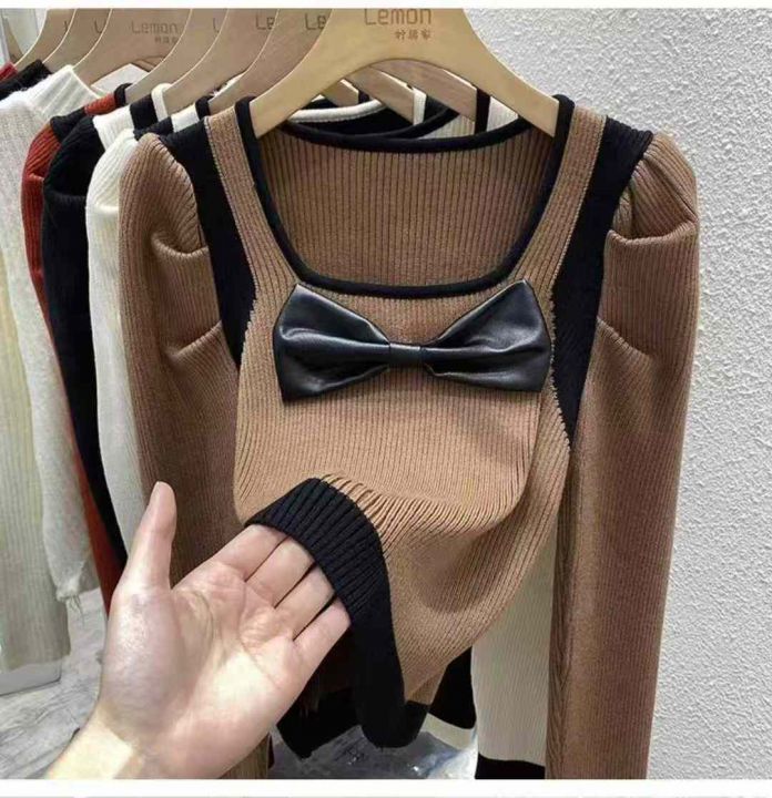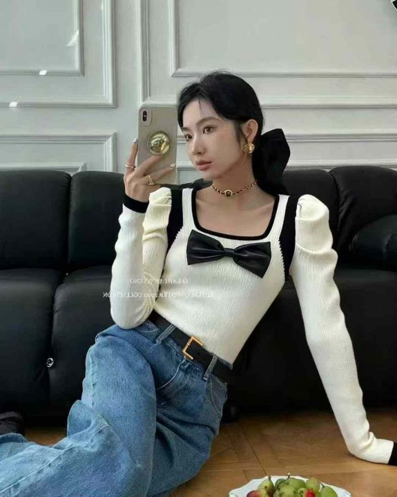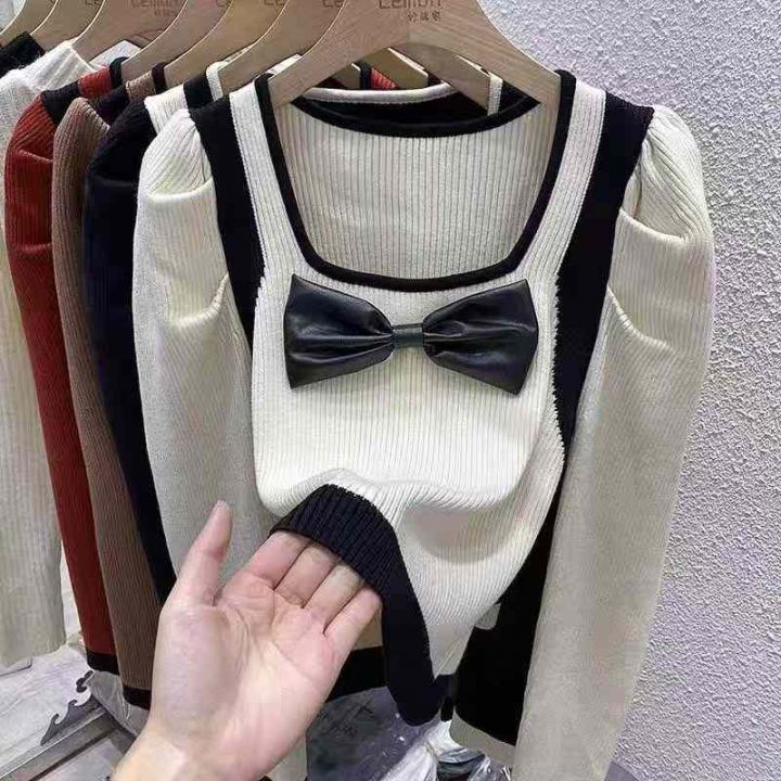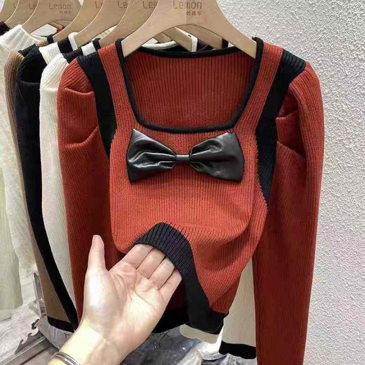 秋季新款小香风设计款泡泡袖法式方领蝴蝶结洋气长袖针织套头毛衣,独立包装,单款多色,均码面料柔软舒弹力大,800件,全清6.9元超低价秒杀!分货加一!