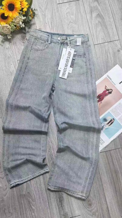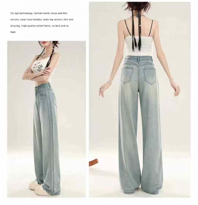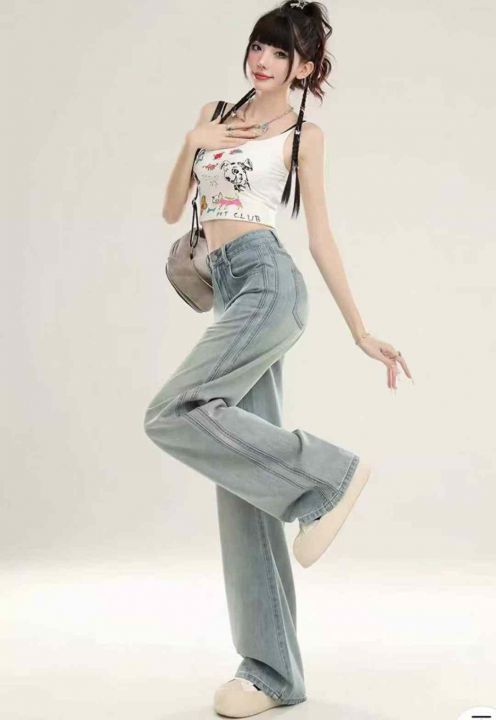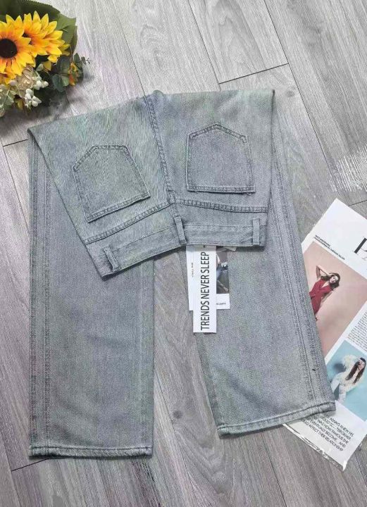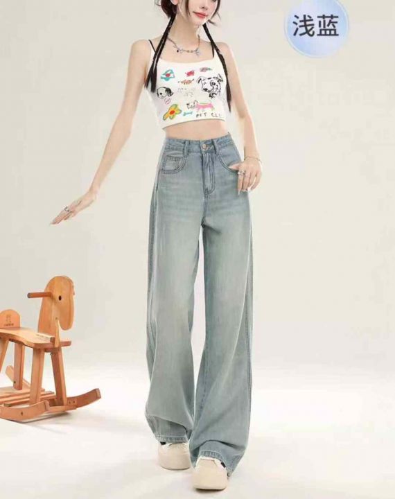 秋季新品洗水棉浅蓝色宽松阔腿高腰显瘦牛仔裤,独立包...