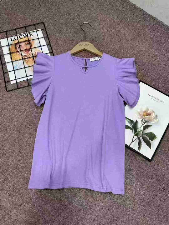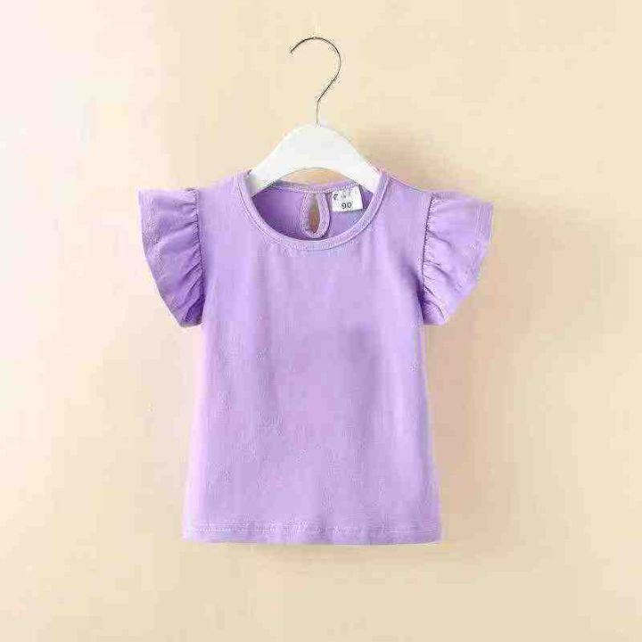 韩版夏季儿童装短袖T恤2025女童上衣宝宝无袖甜美纯棉飞飞袖洋气,102件,码数6-14y,单款单色,模特图只供参考。