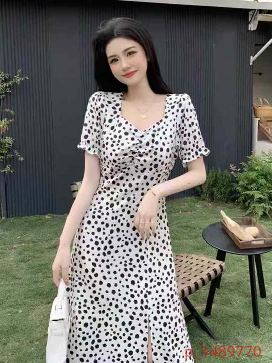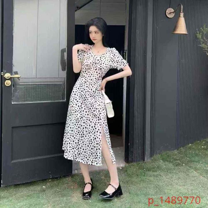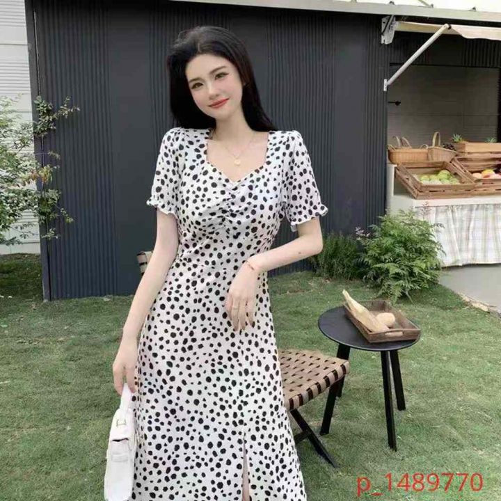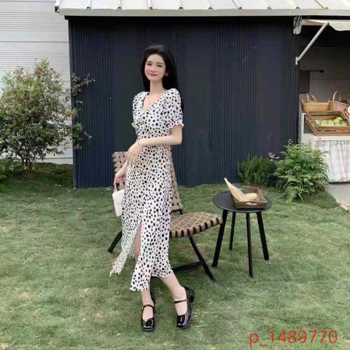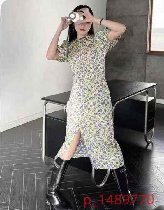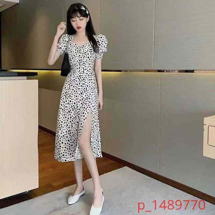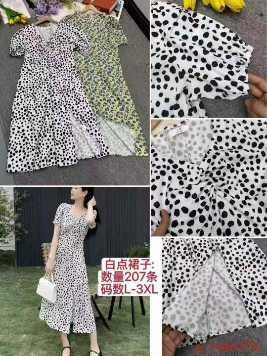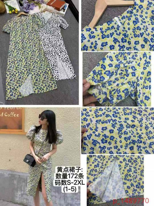 夏装热卖泡泡袖收腰显瘦气质法式复古碎花开叉过膝雪纺中长连衣裙,两个整款,独立包装,码数S-3XL(1-5),数量379条,图5.6有详细数量码数,分货加1,(货号0913#41) _@_@