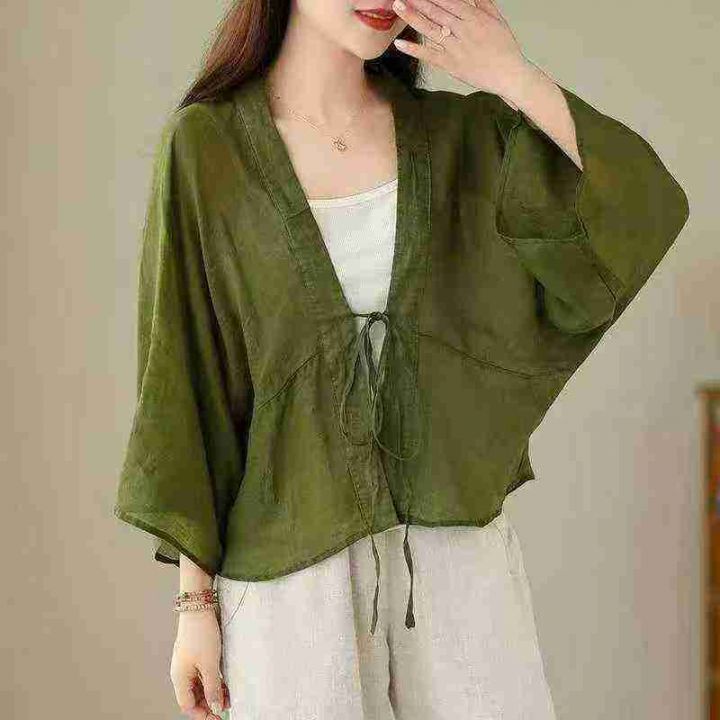 夏季文艺大码宽松蝙蝠袖苎麻开衫轻薄短外套纯色V领系带防晒衣女,均码,201件,独立包装,(货号915#58) 分货+1