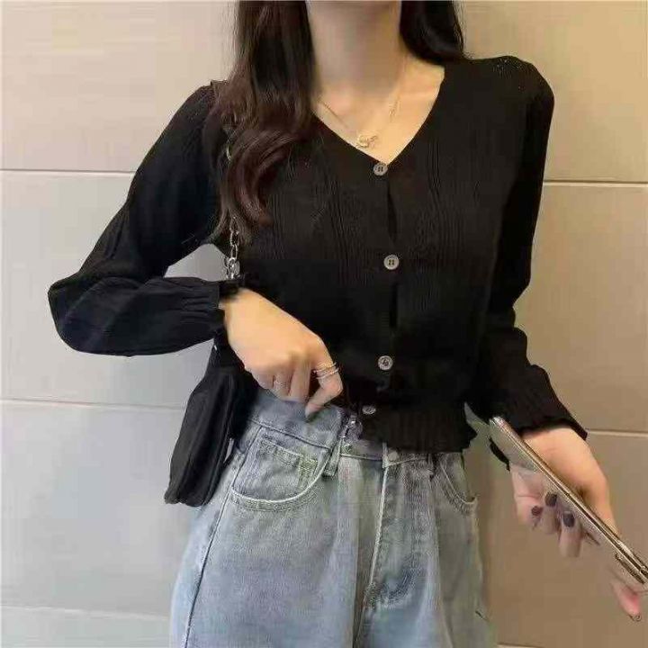 捡漏款,秋季新款木耳边设计款韩版V领镂空百搭长袖针织毛衣开衫,独立包装...