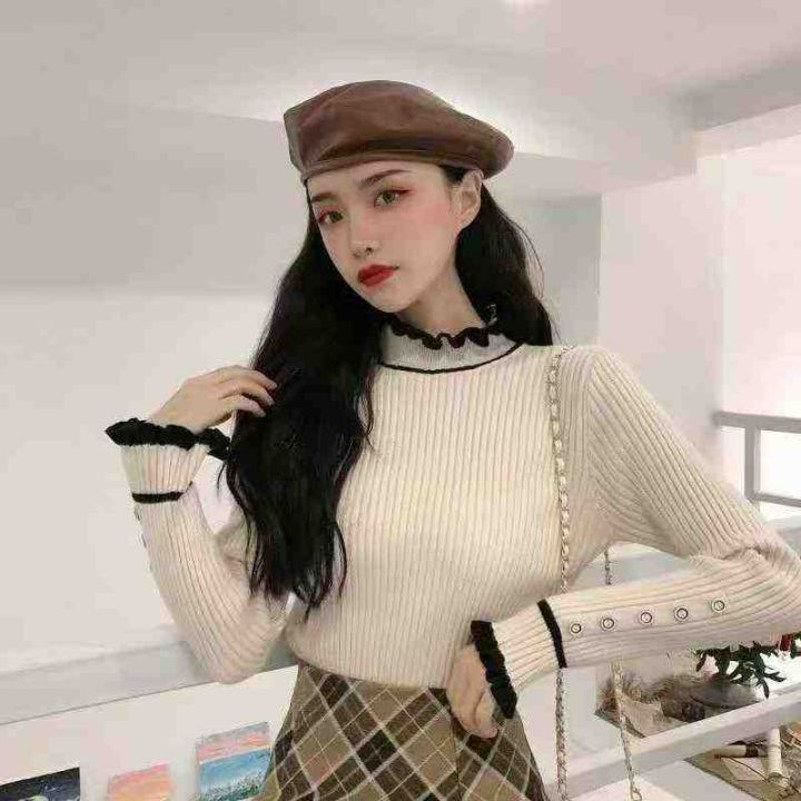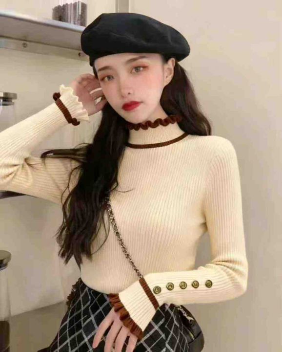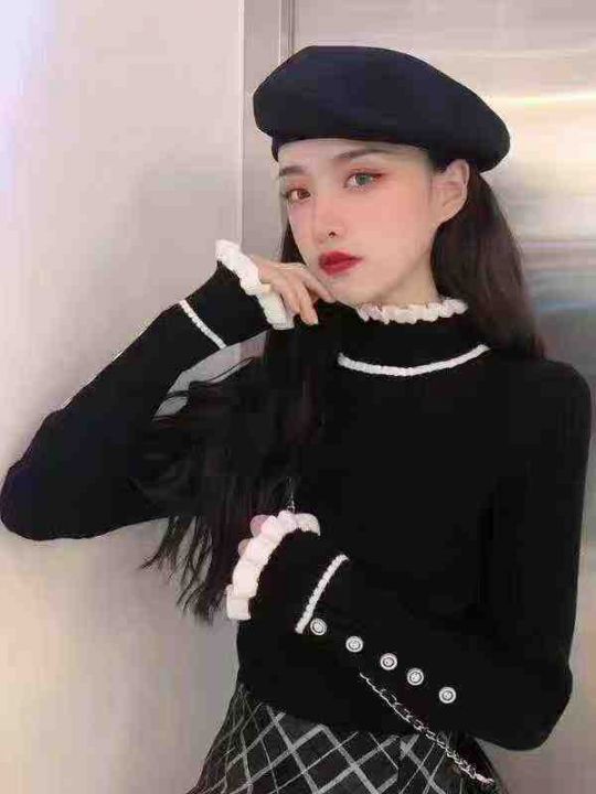 秋冬新款法式温柔木耳边洋气半高领弹力修身显瘦包芯纱...