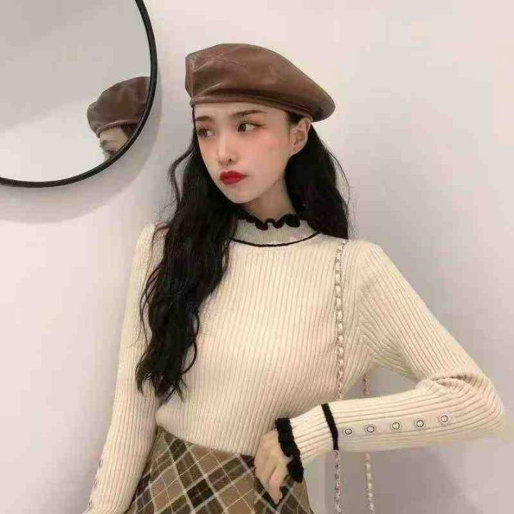 秋冬新款法式温柔木耳边洋气半高领弹力修身显瘦包芯纱...