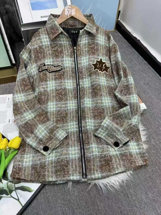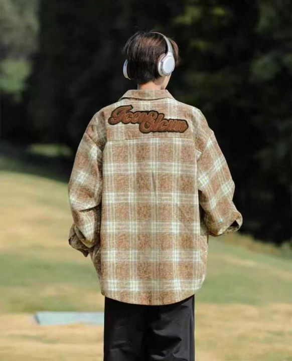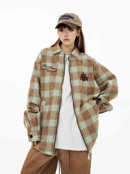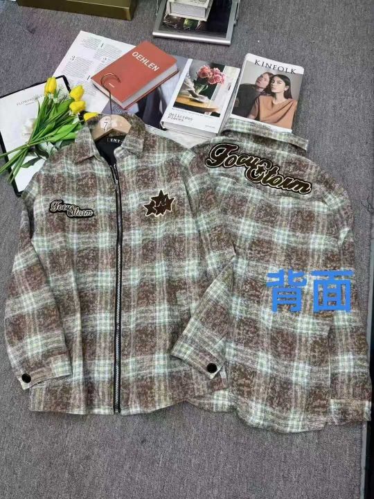 全清13.8美式vibe刺绣格子夹克男女同款春秋季宽松外套...