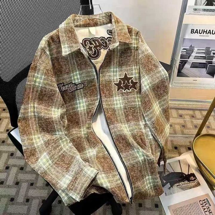 美式vibe刺绣格子夹克男女同款春秋季宽松外套潮牌复古痞帅情侣衣服,221件,M-2XL码,型号:0618#30,分货➕1