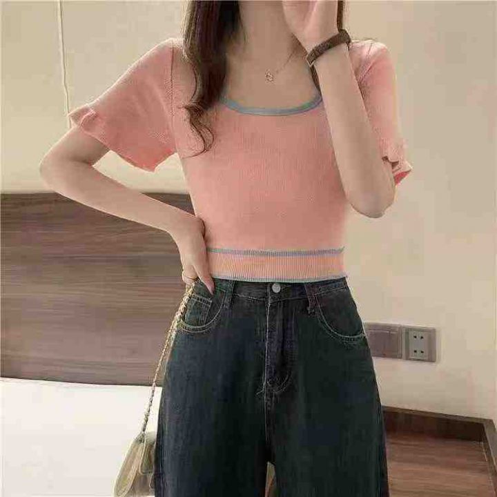 夏季新款高弹力方领木耳边法式奶系温柔风针织短袖T桖...