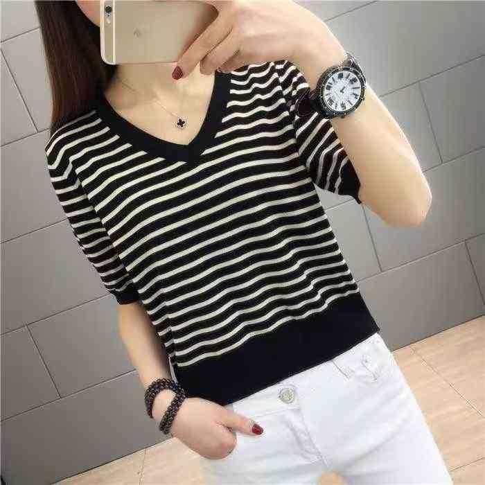 夏季新款撞色条纹V领宽松百搭针织T桖,独立包装,均码...
