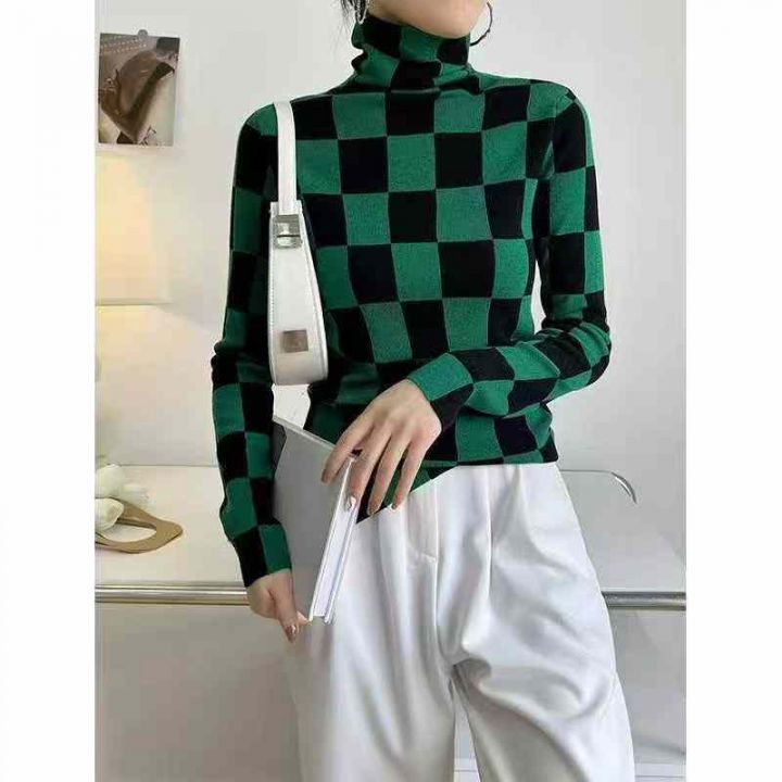 秋冬新款高品质欧洲站复古棋盘格拼色高领弹力修身显瘦...