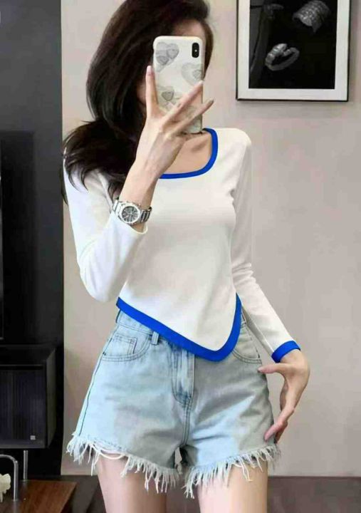 秋冬新款撞色高腰设计不规则纯欲风短款针织套头毛衣,...