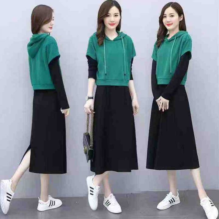 捡漏款,大码女装宽松慵懒风连帽卫衣服马甲+棉T桖长裙...