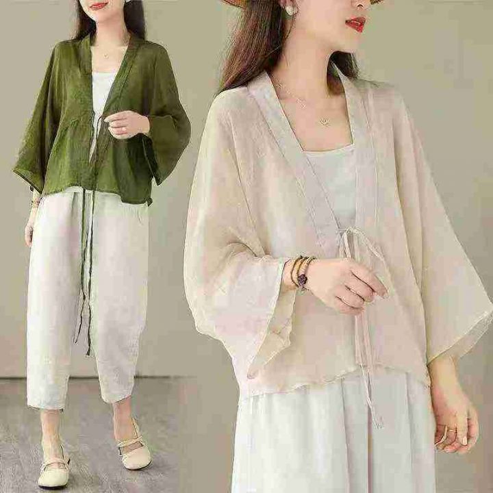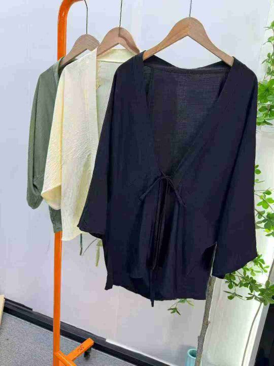 夏季文艺大码宽松蝙蝠袖苎麻开衫轻薄短外套纯色V领系带防晒衣女,均码,201件,独立包装,(货号915#58) 分货+1