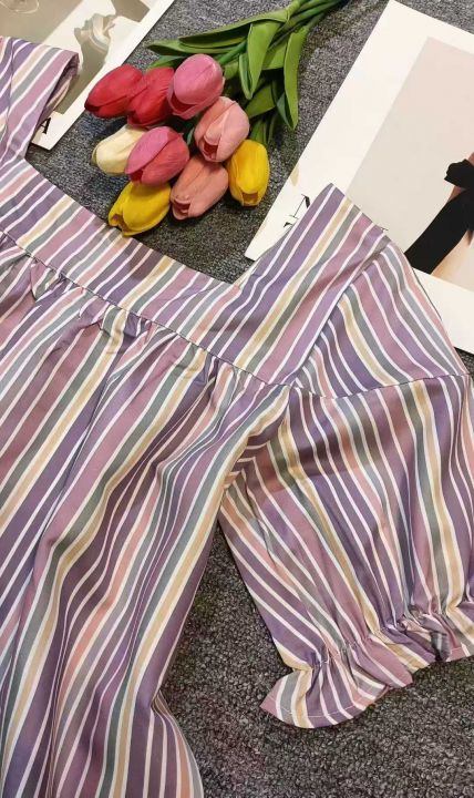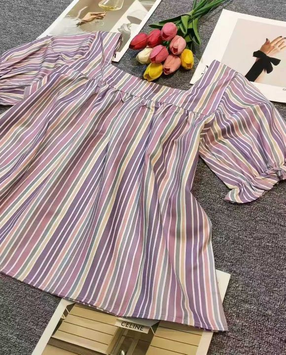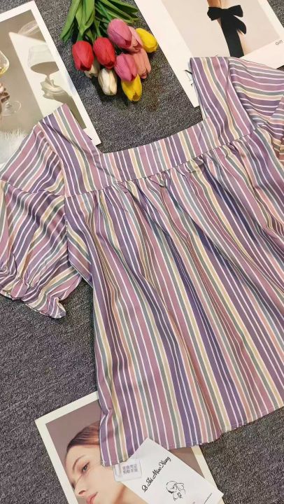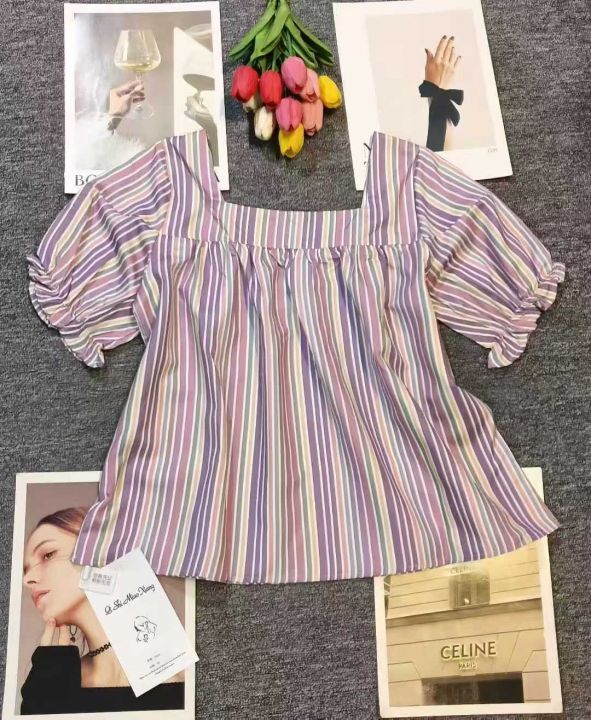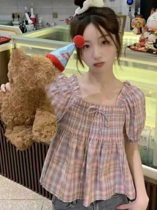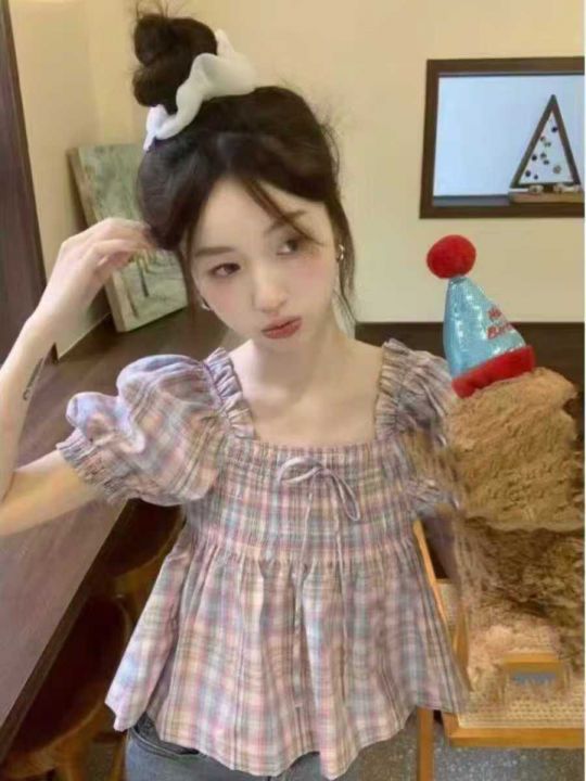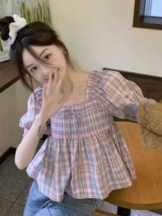 甜美彩色格子条纹方领泡泡袖上衣,60件左右,款号#7023,码数S-2XL,可穿80-140斤,万佳档口新货,原包装无瑕疵,(模特图仅供参考),实体店品质