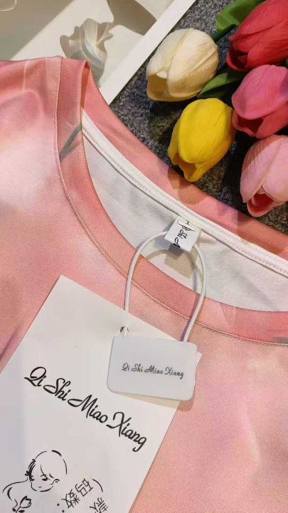 上新全清:5.8一件气质独特别致粉色印花显瘦五分袖T恤...
