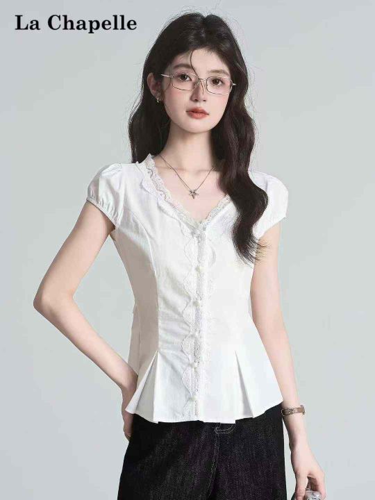 夏季法式蕾丝花边V领名媛风设计甜美收腰白色纯棉衬衫...