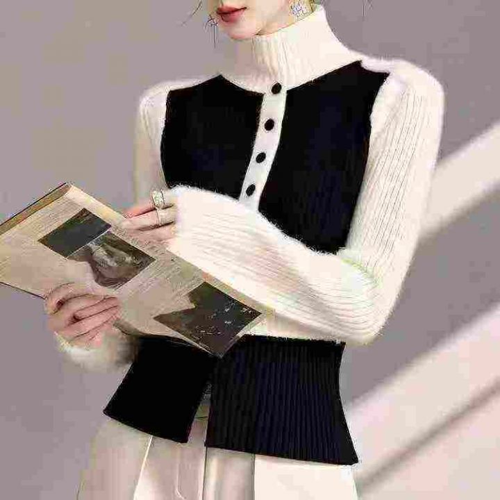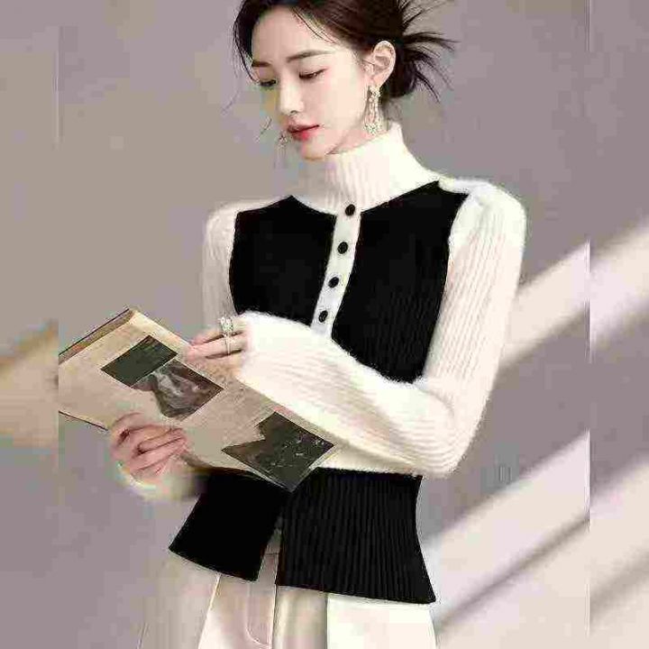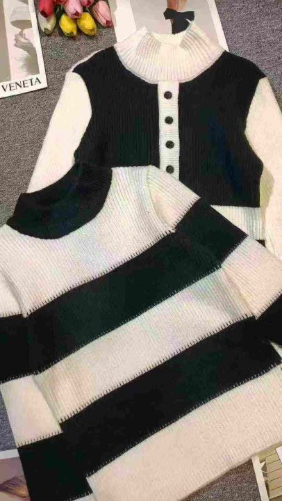 慵懒风黑白撞色半高领轻糯针织毛衣,[爱心]250件左右,两个款,黑色高领无扣为主,均码,穿80-130斤,万佳档口货,原包装️无瑕疵,[666]实体店品质,分货加一