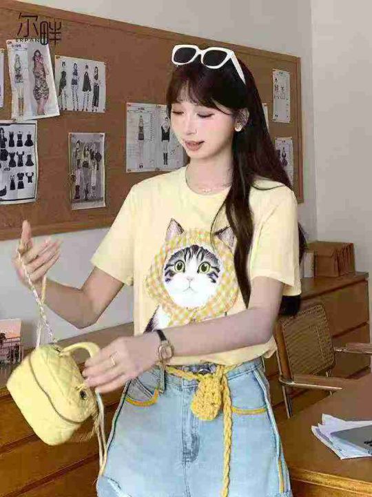 多巴胺甜美减龄小猫印花设计感T恤,[爱心]90件左右,黄色为主,码数S-XL,穿80-130斤,万佳档口货,原包装️无瑕疵,[666]实体店品质,分货加一