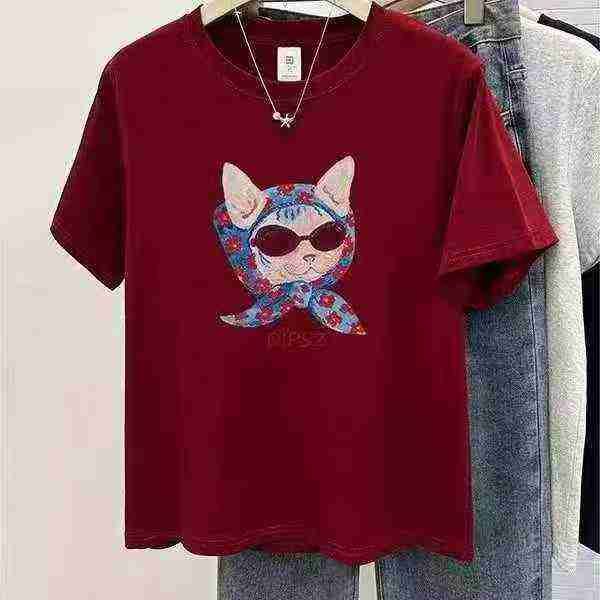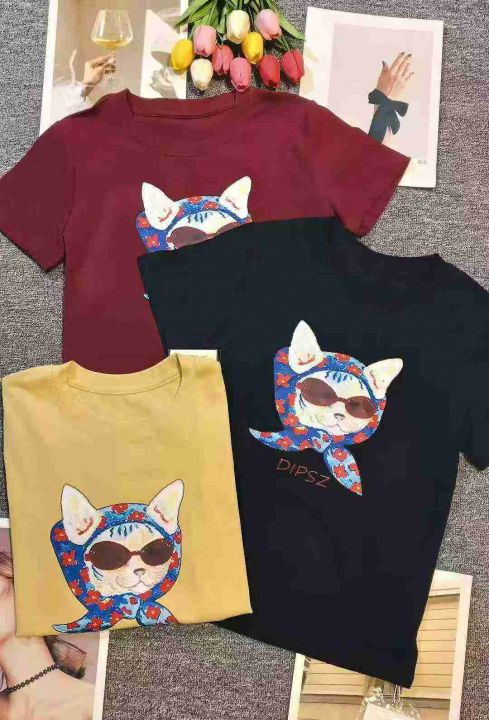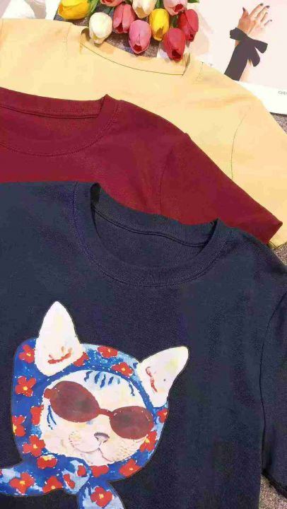 韩版可爱小众卡通猫印花显瘦百搭T恤,[爱心]100件左右,酒红色为主,码数S-XL,穿80-130斤,万佳档口货,原包装️无瑕疵,[666]实体店品质,分货加一