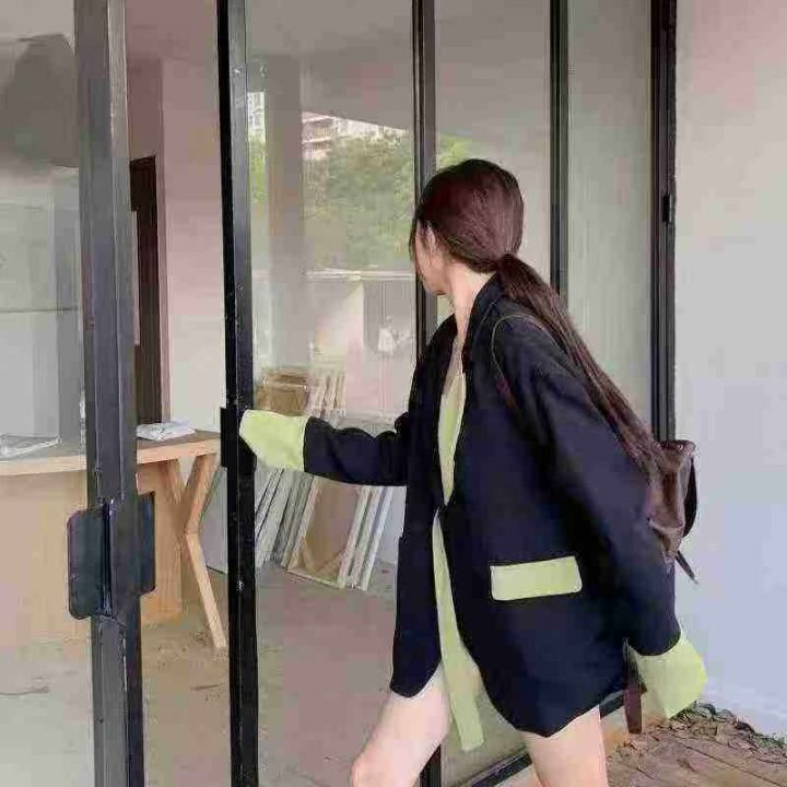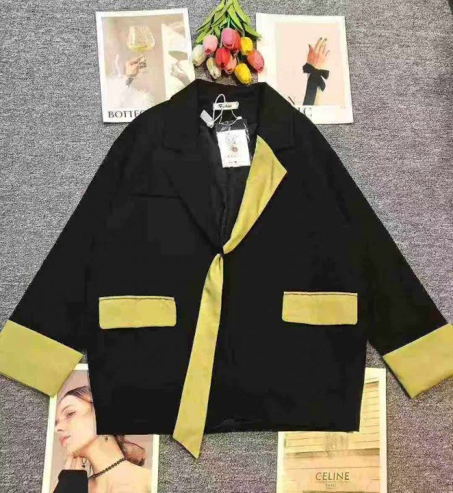 韩系飘带黑色撞色宽松西装外套,[爱心]165件左右,码数S-L,穿80-140斤,万佳档口货,原包装️无瑕疵,[666]实体店品质,分货加一