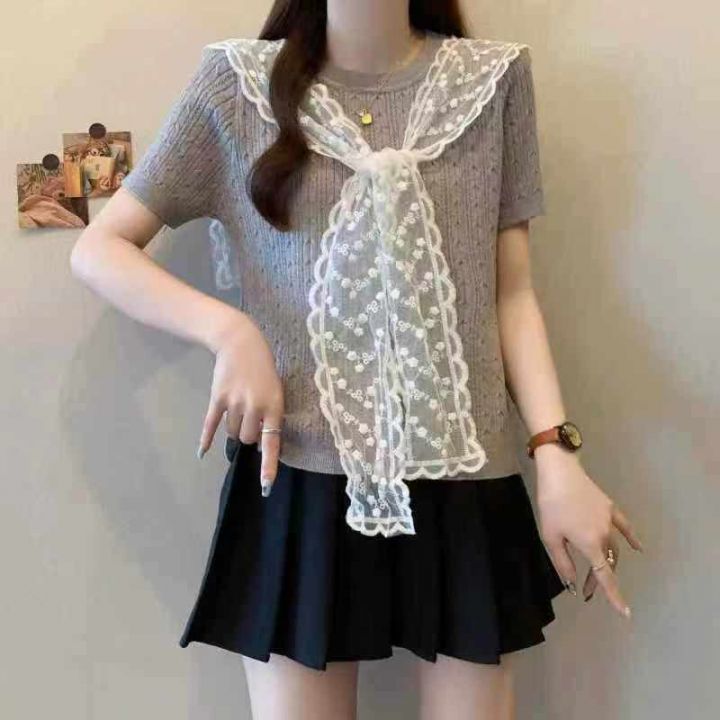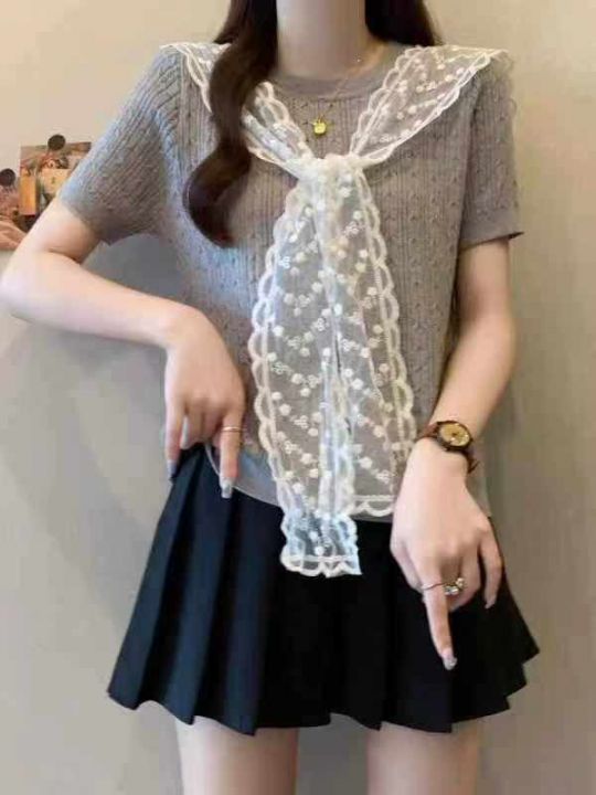夏季新款学院风圆领针织t恤+韩系超好看高级甜美俏皮蕾...