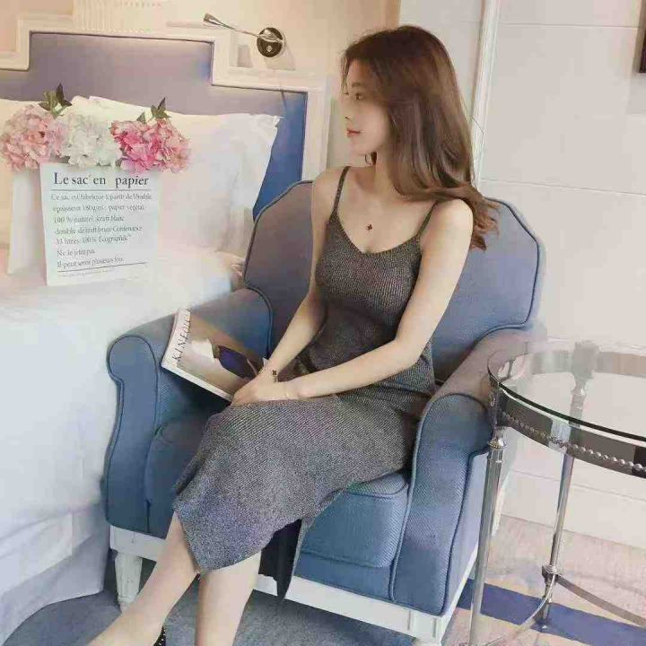 夏季新款弹力修身显瘦开叉设计款法式毛衣吊带针织连衣裙,独立包装,均码面...
