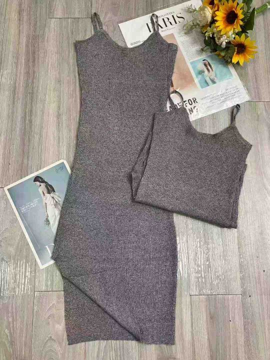 夏季新款弹力修身显瘦开叉设计款法式毛衣吊带针织连衣...