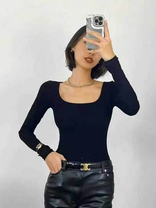 3800多件女款方领长袖高弹修身显瘦打底衫,尺码:XS...