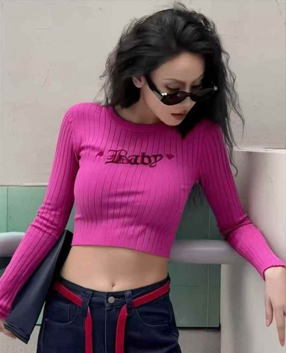 秋季新品纯欲甜辣短款字母刺绣针织长袖圆领套头毛衣,...