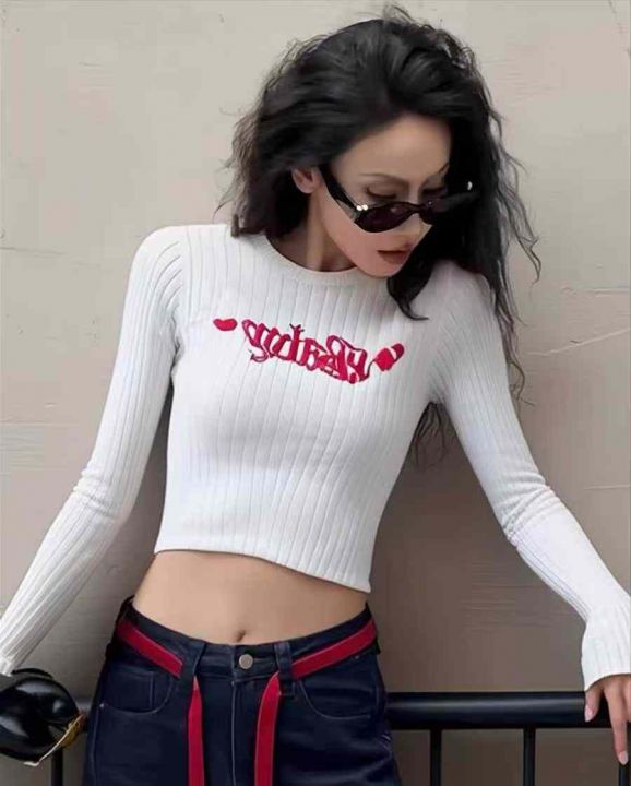 秋季新品纯欲甜辣短款字母刺绣针织长袖圆领套头毛衣,...